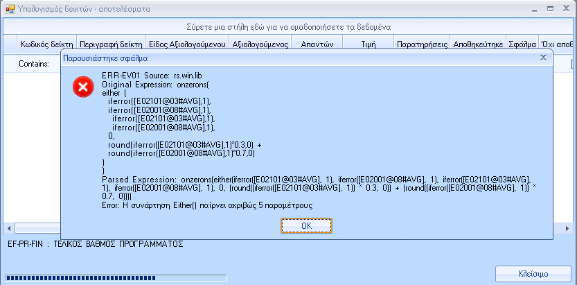 Σε περίπτωση που έχετε κάνει κάποιο λάθος στην σύνταξη της μαθηματικής φόρμουλας κάποιου δείκτη και αυτό προκαλέσει σφάλμα στον υπολογισμό, τότε η διαδικασία του υπολογισμού θα διακοπεί, θα εμφανιστεί ένα παράθυρο με πληροφορίες για το σφάλμα και θα δείτε που ακριβώς είναι, έτσι ώστε αντίστοιχα να το διορθώσετε.