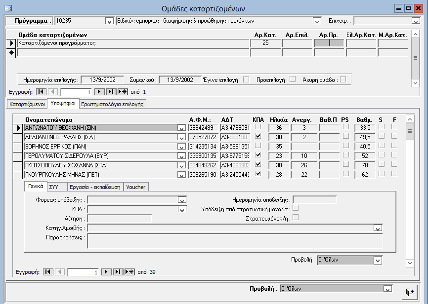 Με την εργασία αυτή γίνεται η σύνδεση ανάμεσα στους υποψήφιους / καταρτιζόμενους και τα προγράμματα στα οποία συμμετέχουν. Οι υποψήφιοι / καταρτιζόμενοι πρέπει να είναι ήδη καταχωρημένοι στο αρχείο καταρτιζομένων/Ωφελουμένων(Καταρτιζόμενοι/Ωφελούμενοι – Διαχείριση καταρτιζομένων), και τα προγράμματα πρέπει να έχουν ήδη δημιουργηθεί στο αρχείο προγραμμάτων (Προγράμματα – Διαχείριση προγραμμάτων)