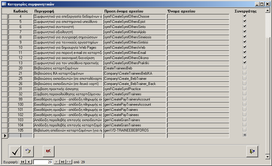 Στην οθόνη αυτή καταχωρούνται τα διαφορετικά είδη συμφωνητικών για κάθε είδος συνεργάτη.