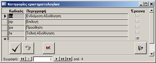 - Κατηγορία (στοιχείο από τον πίνακα «Κατηγορίες ερωτηματολογίων»): Ο χρήστης έχει την δυνατότητα να συμπληρώσει ελεύθερα αυτόν τον πίνακα, να φτιάξει δηλαδή δικές του κατηγορίες ερωτηματολογίων.