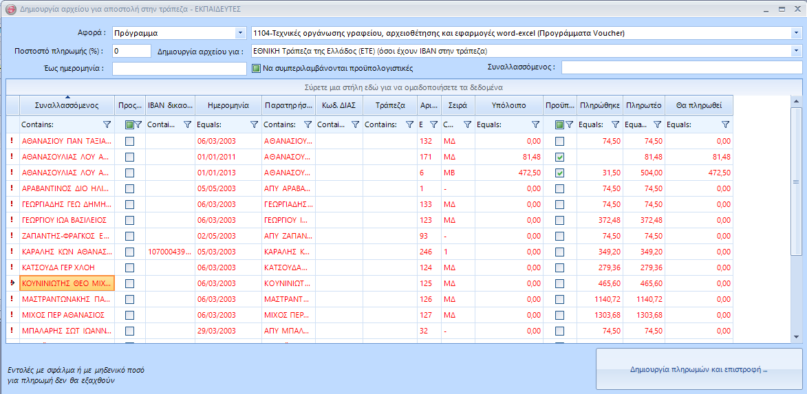Στο πεδίο "Συναλλασσόμενος" μπορείτε να βάλετε φίλτρο επιλογής συγκεκριμένων εκπαιδευτών. Πχ "Κωνσταντινόπ*" κ.ο.κ.