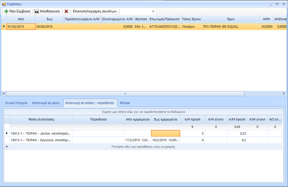 Προστέθηκε η δυνατότητα κατανομής των προϋπολογιστικών ΑΗ, σε κάποιο υποέργο, σε «Φάσεις υλοποίησης» και «Παραδοτέα». Η ανάλυση γίνεται στη σελίδα «Κατανομή σε φάσεις – παραδοτέα». Στην περίπτωση που οι ημερομηνίες έναρξης ή λήξης είναι κενές, το σύστημα λαμβάνει υπόψη τις ημερομηνίες στη σελίδα «Γενικά στοιχεία».