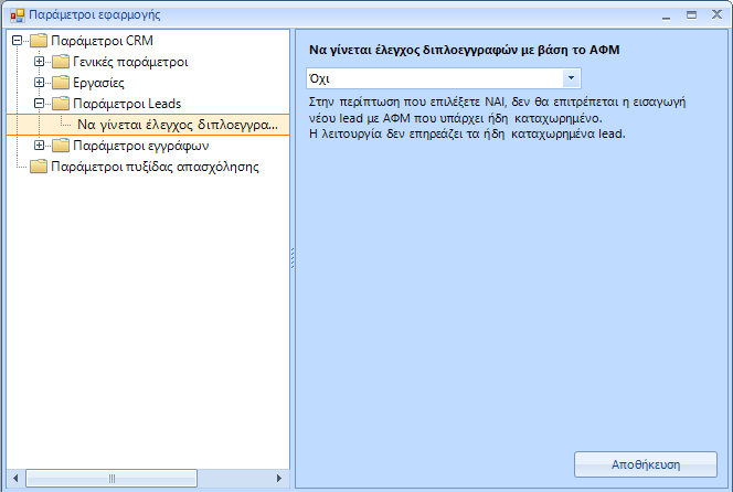 Μετά από απαίτηση μερικών από τους χρήστες της εφαρμογής προστέθηκε η δυνατότητα ελέγχου μοναδικότητας του ΑΦΜ των lead. Η δυνατότητα αυτή όμως θα πρέπει να ενεργοποιηθεί από όσους την επιθυμούν. Η ενεργοποίηση (ή η απενεργοποιηση αργότερα) γίνεται από το CRM, στην επιλογή «Εργαλεία-> Παράμετροι -> Γενικές παράμετροι». Στην φόρμα που θα ανοίξει επιλέγετε στις παραμέτρους «Leads» την παράμετρο «Να γίνεται έλεγχος διπλοεγγραφών με βάση το ΑΦΜ» και ακολουθως επιλέγετε «ΝΑΙ» ή «ΟΧΙ κατά το δοκούν. Μην ξεχάσετε να πατήσετε το αποθήκευση μετά την επιλογή σας.