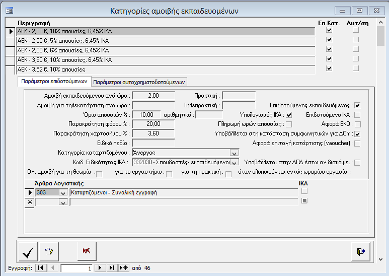 Στις κατηγορίες αμοιβής καταρτιζομένων προστέθηκαν δύο ακόμα πεδία αμοιβής ανά ώρα τα οποία αφορούν την αμοιβή του καταρτιζόμενοι για θεωρία και πρακτική αντίστοιχα με ασύγχρονη τηλεκατάρτιση. Κατά συνέπεια ανακεφαλαιώνουμε την χρήση όλων των πεδίων αμοιβής ανά ώρα :