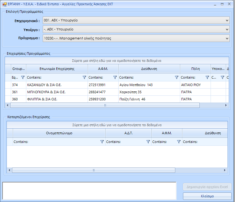 Από την παρακάτω φόρμα, επιλέγετε το πρόγραμμα και την εταιρία, και ακολούθως με το κουμπί «Δημιουργία αρχείου excel» μπορείτε να παράξετε τα στοιχεία τοποθέτησης των ωφελουμένων στην εταιρία και ακολούθως να αποστείλετε το αρχείο excel σε αυτήν για να προχωρήσει στην καταχώρηση στο ΕΡΓΑΝΗ.